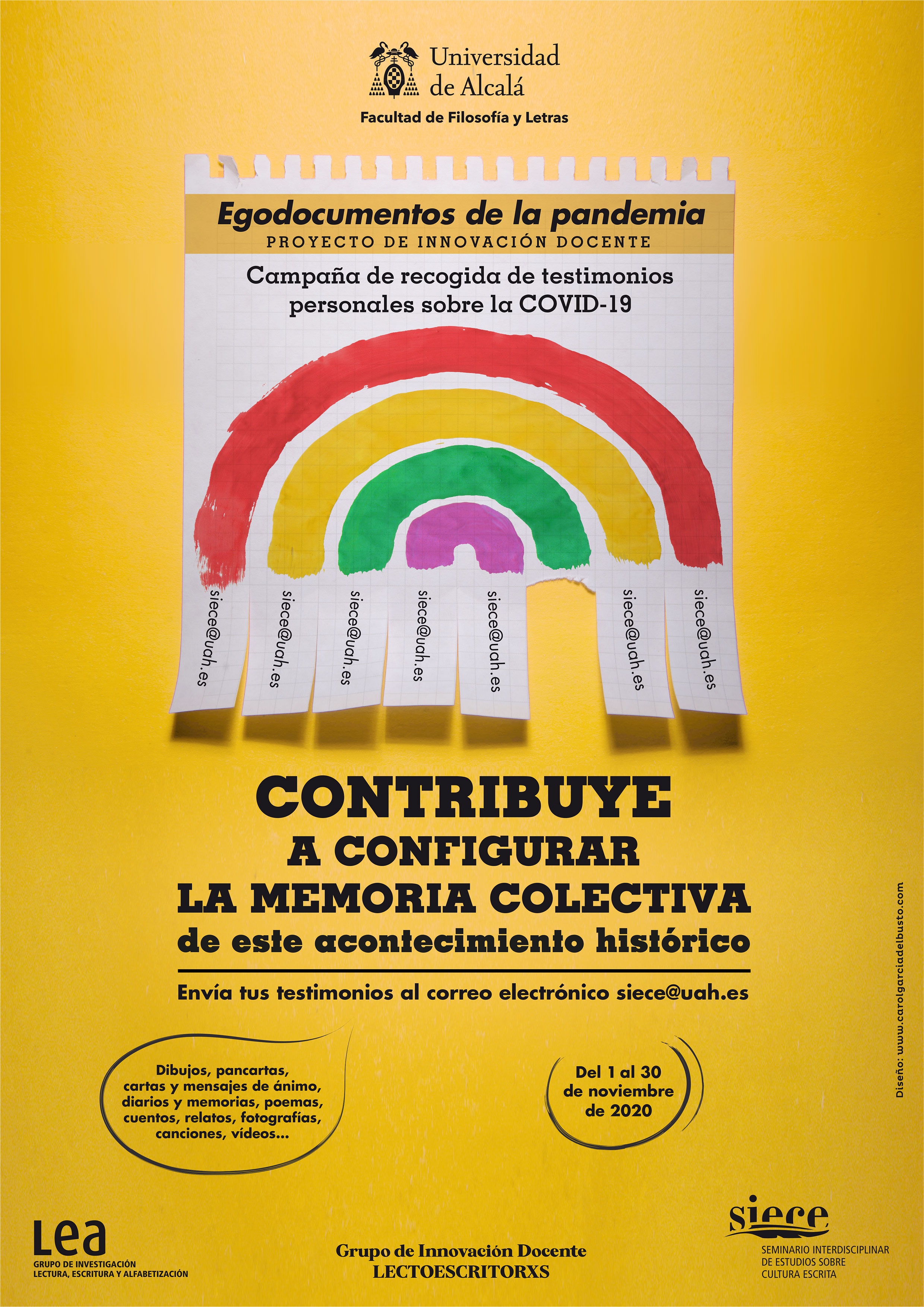 Egodocumentos de la pandemia, es un Proyecto de Innovación Docente de la Universidad de Alcalá (UAH/EV1208) promovido por el Grupo de Innovación Docente en Historia de la escritura y de la lectura (LECTOESCRITORXS) de la Universidad de Alcalá.
